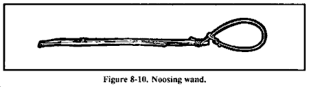 A noose stick or "noosing wand" is useful for capturing roosting birds or small mammals (Figure 8-10). It requires a patient operator. This wand is more a weapon than a trap. It consists of a pole (as long as you can effectively handle) with a slip noose of wire or stiff cordage at the small end. To catch an animal, you slip the noose over the neck of a roosting bird and pull it tight. You can also place it over a den hole and hide in a nearby blind. When the animal emerges from the den, you jerk the pole to tighten the noose and thus capture the animal. Carry a stout club to kill the prey.
