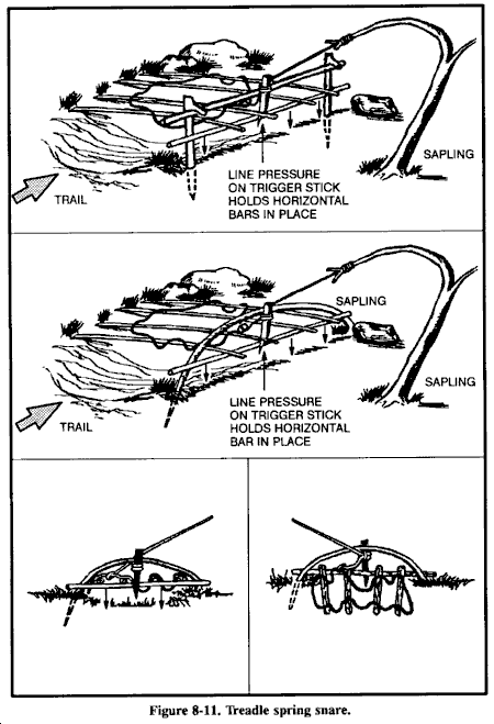 Use a treadle snare against small game on a trail (Figure 8-11). Dig a shallow hole in the trail. Then drive a forked stick (fork down) into the ground on each side of the hole on the same side of the trail. Select two fairly straight sticks that span the two forks. Position these two sticks so that their ends engage the forks. Place several sticks over the hole in the trail by positioning one end over the lower horizontal stick and the other on the ground on the other side of the hole. Cover the hole with enough sticks so that the prey must step on at least one of them to set off the snare. Tie one end of a piece of cordage to a twitch-up or to a weight suspended over a tree limb. Bend the twitch-up or raise the suspended weight to determine where You will tie a 5 centimeter or so long trigger. Form a noose with the other end of the cordage. Route and spread the noose over the top of the sticks over the hole. Place the trigger stick against the horizontal sticks and route the cordage behind the sticks so that the tension of the power source will hold it in place. Adjust the bottom horizontal stick so that it will barely hold against the trigger. A the animal places its foot on a stick across the hole, the bottom horizontal stick moves down, releasing the trigger and allowing the noose to catch the animal by the foot. Because of the disturbance on the trail, an animal will be wary. You must therefore use channelization.