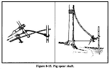 To construct the pig spear shaft, select a stout pole about 2.5 meters long (Figure 8-15). At the smaller end, firmly lash several small stakes. Lash the large end tightly to a tree along the game trail. Tie a length of cordage to another tree across the trail. Tie a sturdy, smooth stick to the other end of the cord. From the first tree, tie a trip wire or cord low to the ground, stretch it across the trail, and tie it to a catch stick. Make a slip ring from vines or other suitable material. Encircle the trip wire and the smooth stick with the slip ring. Emplace one end of another smooth stick within the slip ring and its other end against the second tree. Pull the smaller end of the spear shaft across the trail and position it between the short cord and the smooth stick. As the animal trips the trip wire, the catch stick pulls the slip ring off the smooth sticks, releasing the spear shaft that springs across the trail and impales the prey against the tree.
