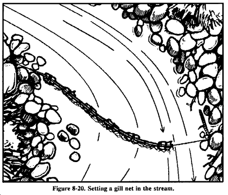 A stakeout is a fishing device you can use in a hostile environment (Figure 8-18). To construct a stakeout, drive two supple saplings into the bottom of the lake, pond, or stream with their tops just below the water surface. Tie a cord between them and slightly below the surface. Tie two short cords with hooks or gorges to this cord, ensuring that they cannot wrap around the poles or each other. They should also not slip along the long cord. Bait the hooks or gorges.