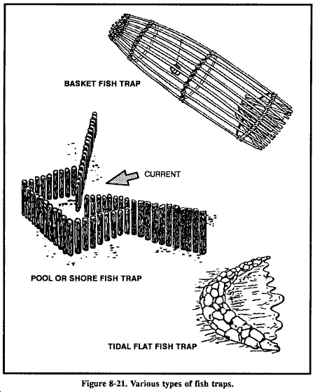 You may trap fish using several methods (Figure 8-21). Fish baskets are one method. You construct them by lashing several sticks together with vines into a funnel shape. You close the top, leaving a hole large enough for the fish to swim through.