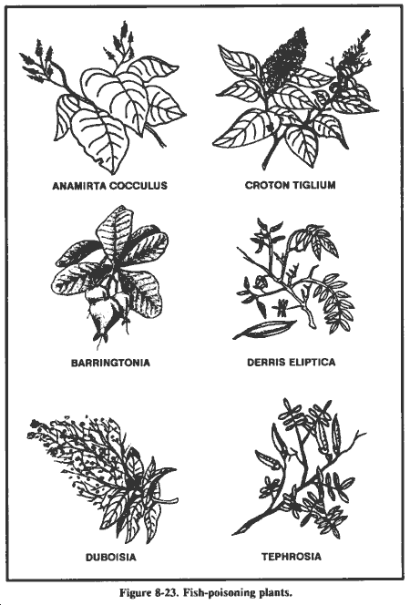- Barringtonia(Figure 8-23). These large trees grow near the sea in Malaya and parts of Polynesia. They bear a fleshy one-seeded fruit. Crush the seeds and bark and throw into the water.