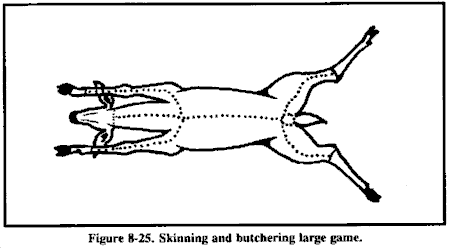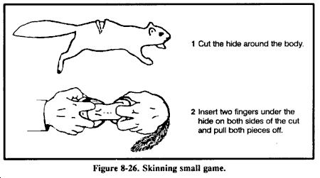 Bleed the animal by cutting its throat. If possible, clean the carcass near a stream. Place the carcass belly up and split the hide from throat to tail, cutting around all sexual organs (Figure 8-25). Remove the musk glands at points A and B to avoid tainting the meat. For smaller mammals, cut the hide around the body and insert two fingers under the hide on both sides of the cut and pull both pieces off (Figure 8-26).