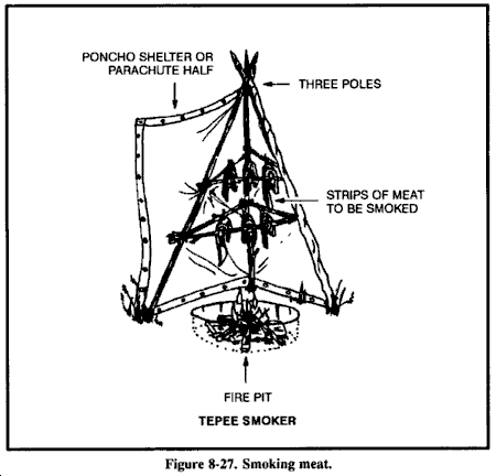 To smoke meat, prepare an enclosure around a fire (Figure 8-27). Two ponchos snapped together will work. The fire does not need to be big or hot. The intent is to produce smoke, not heat. Do not use resinous wood in the fire because its smoke will ruin the meat. Use hardwoods to produce good smoke. The wood should be somewhat green. If it is too dry, soak it. Cut the meat into thin slices, no more than 6 centimeters thick, and drape them over a framework. Make sure none of the meat touches another piece. Keep the poncho enclosure around the meat to hold the smoke and keep a close watch on the fire. Do not let the fire get too hot. Meat smoked overnight in this manner will last about 1 week. Two days of continuous smoking will preserve the meat for 2 to 4 weeks. Properly smoked meat will look like a dark, curled, brittle stick and you can eat it without further cooking. You can also use a pit to smoke meat (Figure 8-28).
