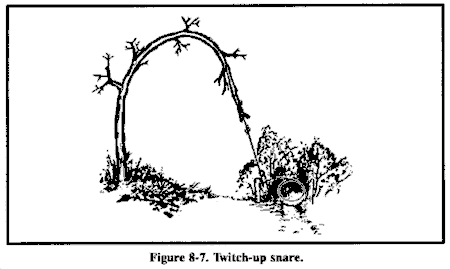 A simple twitch-up snare uses two forked sticks, each with a long and short leg (Figure 8-7). Bend the twitch-up and mark the trail below it. Drive the long leg of one forked stick firmly into the ground at that point. Ensure the cut on the short leg of this stick is parallel to the ground. Tie the long leg of the remaining forked stick to a piece of cordage secured to the twitch-up. Cut the short leg so that it catches on the short leg of the other forked stick. Extend a noose over the trail. Set the trap by bending the twitch-up and engaging the short legs of the forked sticks. When an animal catches its head in the noose, it pulls the forked sticks apart, allowing the twitch-up to spring up and hang the prey.