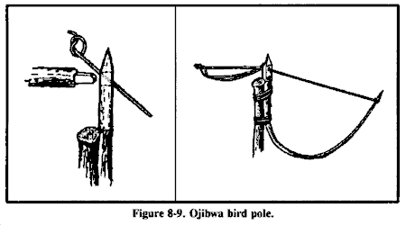 An Ojibwa bird pole is a snare used by native Americans for centuries (Figure 8-9). To be effective, place it in a relatively open area away from tall trees. For best results, pick a spot near feeding areas, dusting areas, or watering holes. Cut a pole 1.8 to 2.1 meters long and trim away all limbs and foliage. Do not use resinous wood such as pine. Sharpen the upper end to a point, then drill a small diameter hole 5 to 7.5 centimeters down from the top. Cut a small stick 10 to 15 centimeters long and shape one end so that it will almost fit into the hole. This is the perch. Plant the long pole in the ground with the pointed end up. Tie a small weight, about equal to the weight of the targeted species, to a length of cordage. Pass the free end of the cordage through the hole, and tie a slip noose that covers the perch. Tie a single overhand knot in the cordage and place the perch against the hole. Allow the cordage to slip through the hole until the overhand knot rests against the pole and the top of the perch. The tension of the overhand knot against the pole and perch will hold the perch in position. Spread the noose over the perch, ensuring it covers the perch and drapes over on both sides. Most birds prefer to rest on something above ground and will land on the perch. As soon as the bird lands, the perch will fall, releasing the over-hand knot and allowing the weight to drop. The noose will tighten around the bird's feet, capturing it. If the weight is too heavy, it will cut the bird's feet off, allowing it to escape.